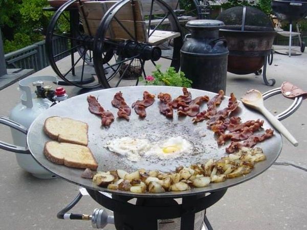 Makers of authentic plow disk cookers also known as discada disco cowboy wok. They typically slide onto a notched axle rod so a plow disc used in agriculture has a hole in the center. Bacon Sausage Potatoes and a Dozen Eggs.